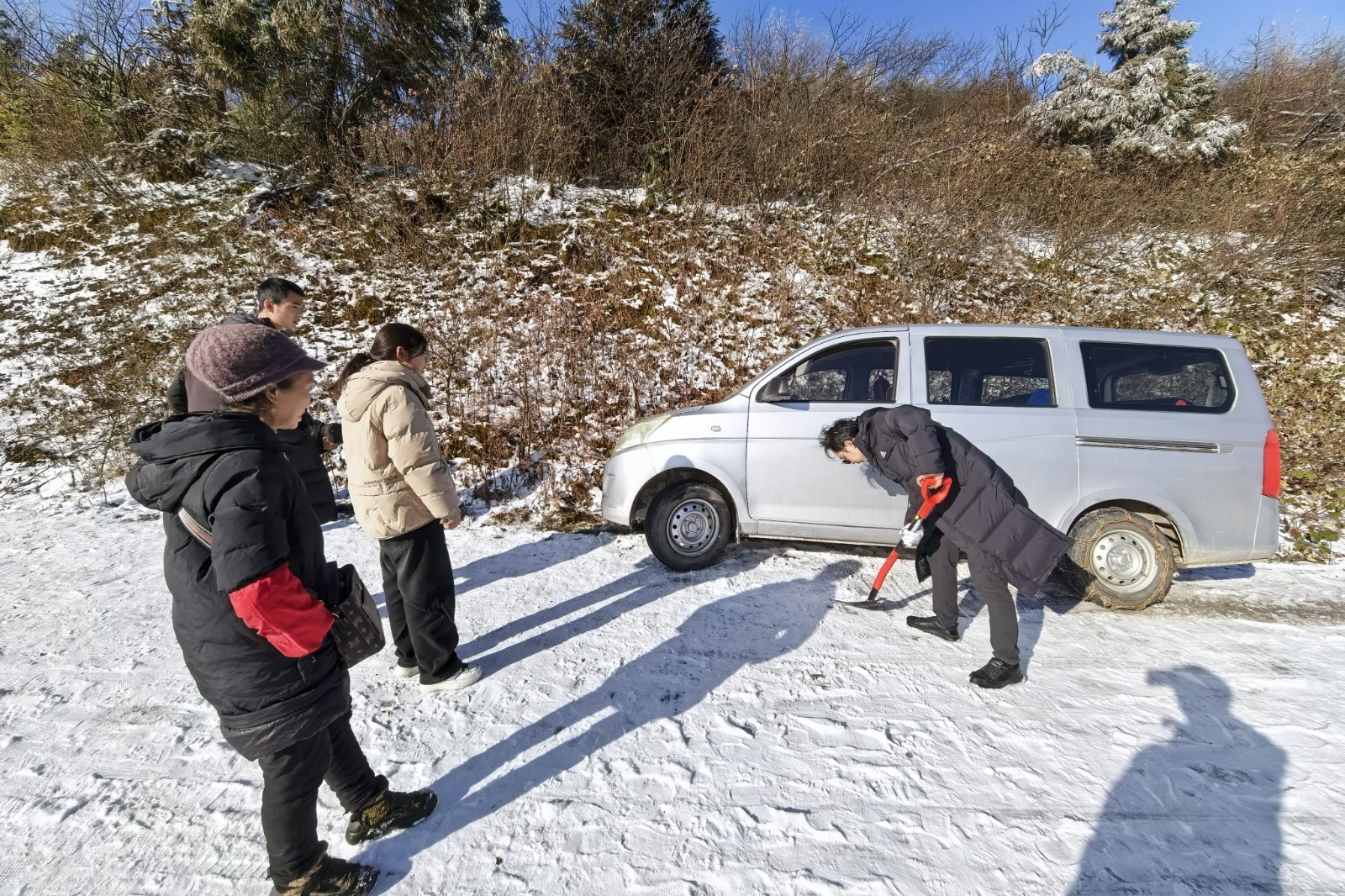 说干就干,,,,他们趴在雪地里一直地翻找。。。地面的雪厚厚的一层,,,,一双双翻找的手泛起猪肝色,,,,被冻得直打颤,,,,但他们一刻也一直。。。通过同心协力的翻找,,,,在面包车车轱辘下的石头逐渐真多,,,,直到倾侧的一边与另一边平行。。。村民一脚油门,,,,面包车如释重负般从沟渠中解脱出来。。。